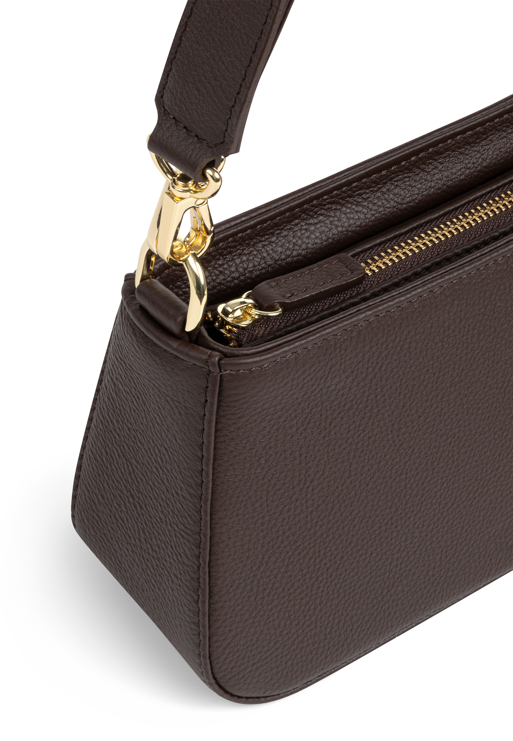 This bag has a detachable handle and a strap, therefore you can carry it over the shoulder or crossbody. One compartment inside, a card pocket and an additional pocket where you can put the most necessary items.