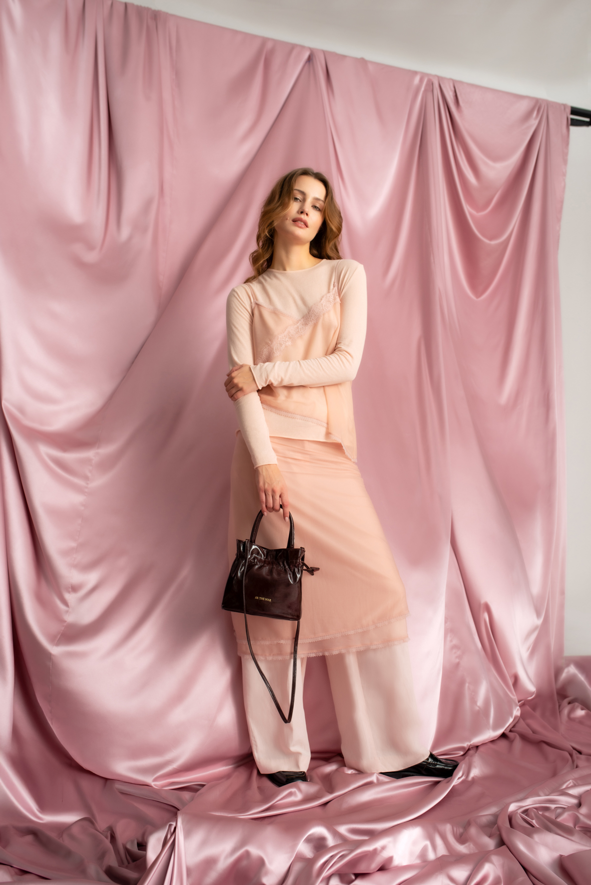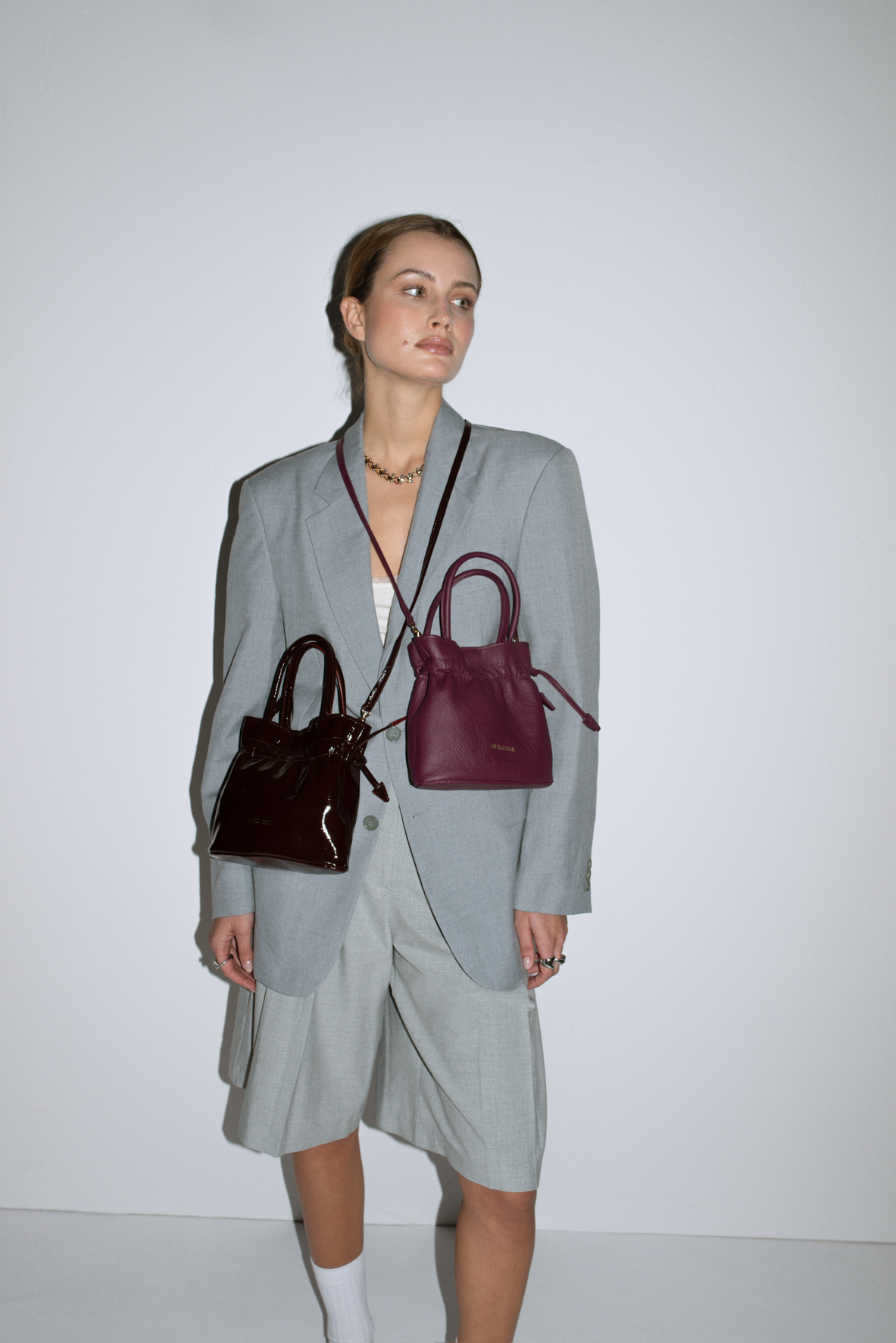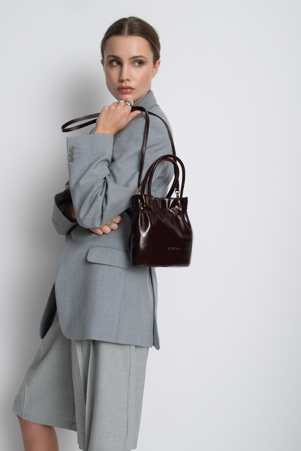 The bag with a detachable strap. It can be carried three ways: in your hand like a basket, on your shoulder, or crossbody. One compartment secured with a magnetic closure, a zippered pocket inside, and an additional pocket for your essentials. The bag cinches with a drawstring, giving it a beautiful, unique shape.